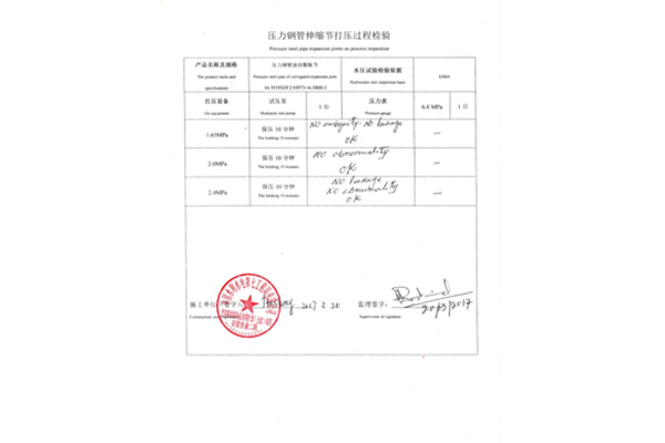 江蘇豐禾機械公司承擔的習總書記一帶一路的巴基斯坦塔貝拉水電站四期工程的壓力鋼管伸縮節(jié),口徑DN11000mm,壓力1.6MPa,軸向±50mm,豎向±30mm,瓦片現(xiàn)場組裝而成,2017年3月20日兩臺伸縮節(jié)水壓試驗一次成功,此項目伸縮節(jié)是在國外水電站項目中口徑較大、水頭較高的產(chǎn)品,填補了國內(nèi)外多項空白。